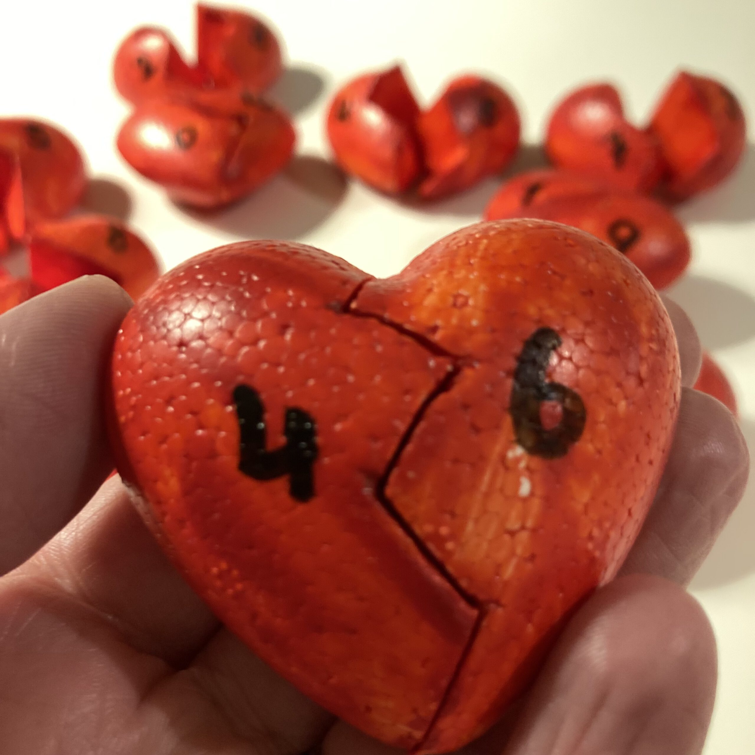 Bij de LTC haalde ik piepschuim harten en een piepschuimsnijder. Elk hart kreeg een andere breuklijn. Om de witte harten een boost te geven, verfde ik ze in drie lagen rood met schoolverf.